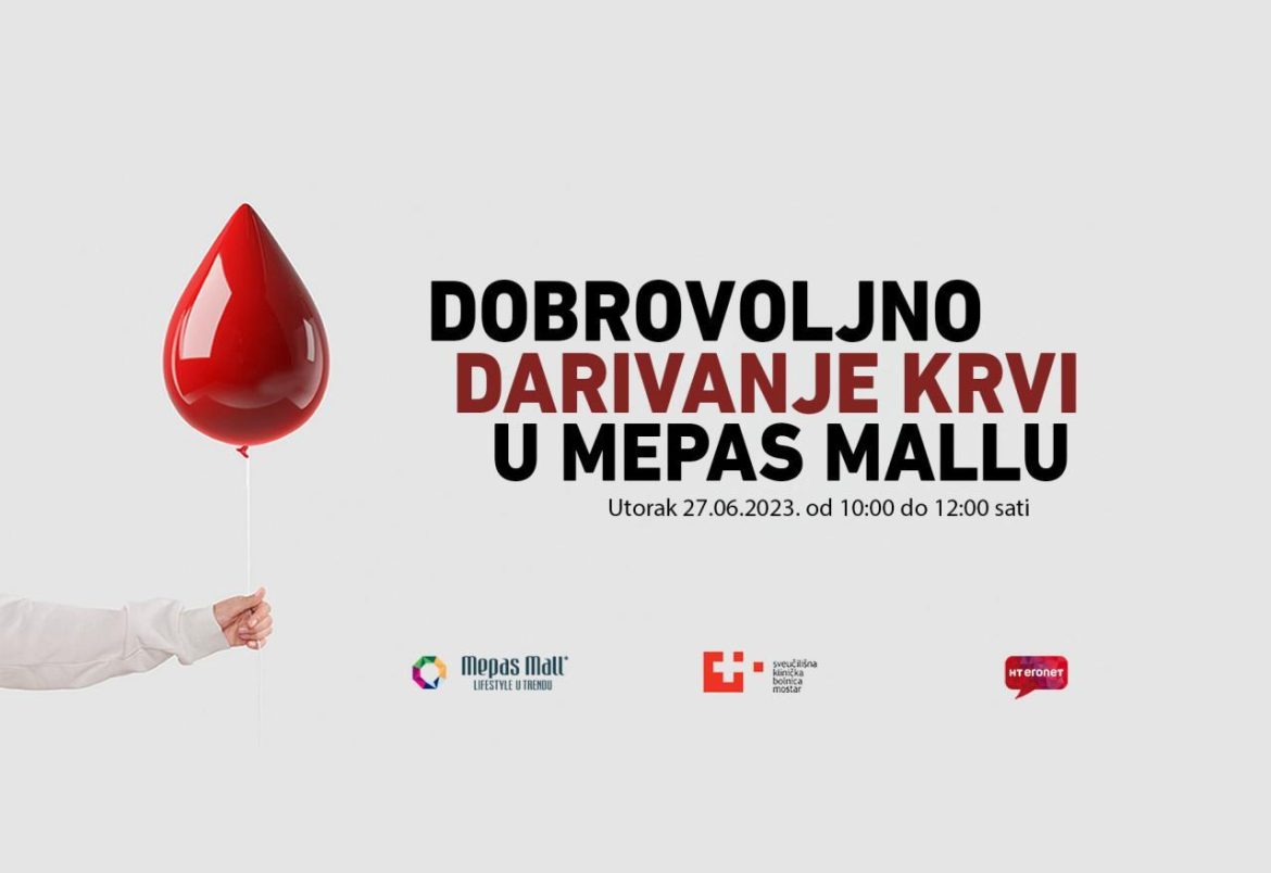 U suradnji sa Zavodom za transfuzijsku medicinu SKB Mostar i HT Eronetom u utorak 27.lipnja od 10:00 do 12:00 sati na 1. katu Mepas Malla bit će organizirana akcija dobrovoljnog darivanja krvi.
