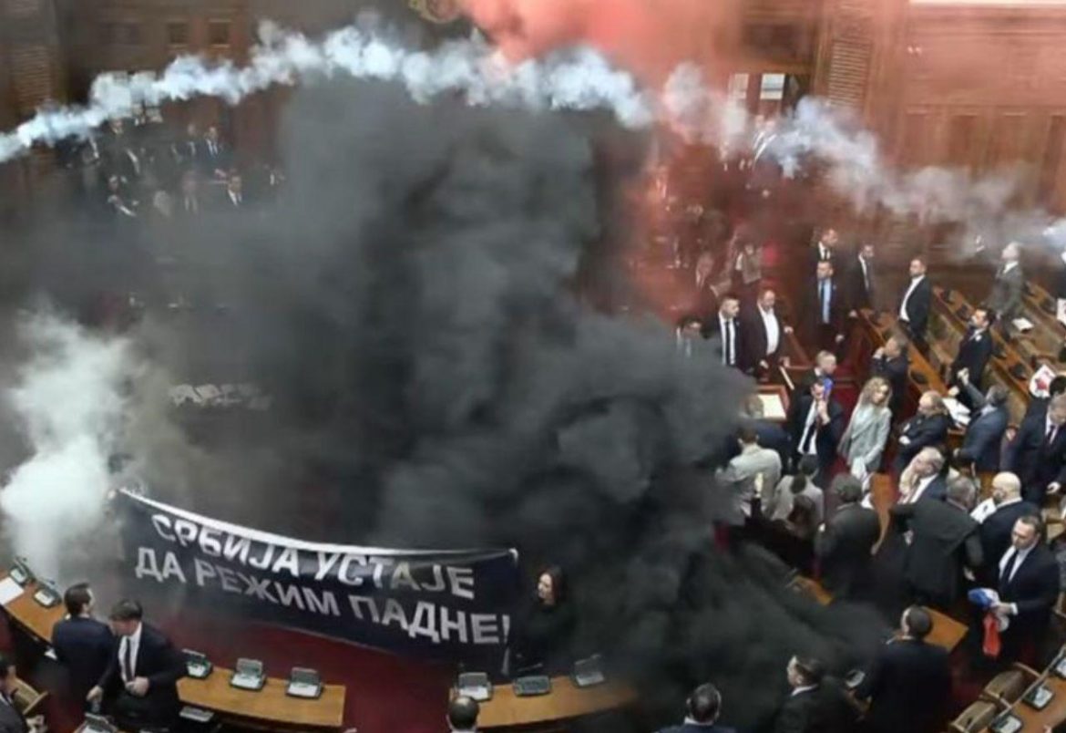 Vrhunac kaosa dogodio se kada su unutar skupštinske sale zapaljene baklje, kakve se inače viđaju na nogometnim stadionima, zbog čega se prostorija brzo ispunila dimom. Ovaj nevjerojatan prizor podsjetio je na prizore s tribina, a ne na parlamentarnu raspravu, dodatno produbljujući političku krizu i tenzije u Srbiji.