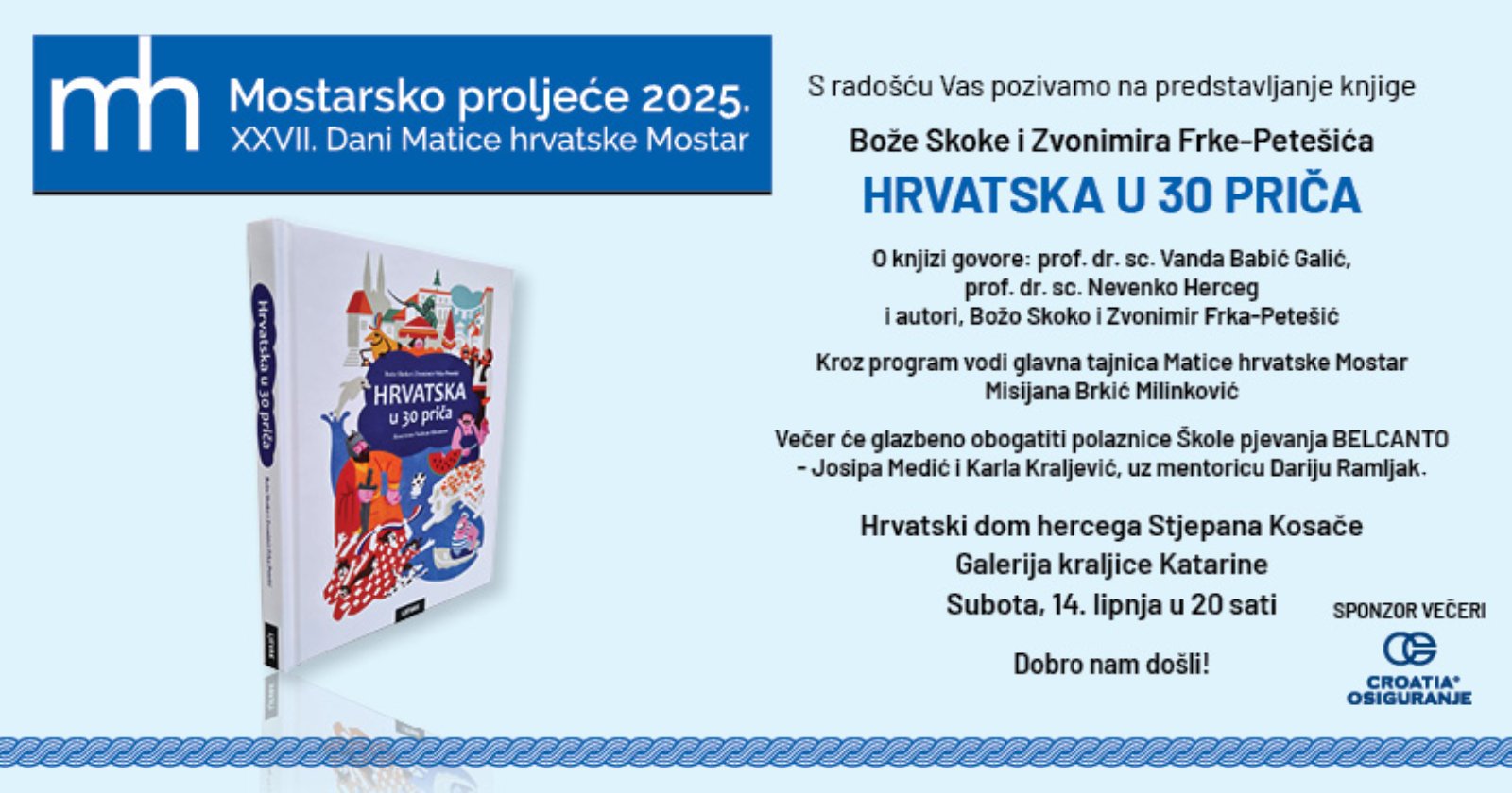 Kad Božo Skoko i Zvonimir Frka-Petešić udruže snage, nastane Hrvatska u 30 priča, najpopularnija knjiga o Hrvatskoj i Hrvatima. Upravo će predstavljanje toga najprodavanijeg publicističkog djela u Hrvatskoj, odnosno njegova drugog izdanja, zatvoriti bogat program Mostarskoga proljeća 2025., koje je u grad na Neretvi u proteklih mjesec i pol dana donijelo niz vrhunskih likovnih, glazbenih, kazališnih i književnih događaja. Knjiga “Hrvatska u 30 priča” bit će predstavljena u subotu, 14. lipnja, s početkom u 20 sati u Galeriji kraljice Katarine u Hrvatskom domu hercega Stjepana Kosače u Mostaru. Već je objavljena na hrvatskom, engleskom i francuskom jeziku, a u pripremi je i njemačko izdanje te već drugu godinu ne silazi s ljestvica najčitanijih knjiga vezanih uz identitet i imidž te posebnosti Hrvatske. Knjiga, odnosno njezini autori, prošle je godine nagrađena prestižnom nagradom Grand Prix Marco Polo svjetske udruge turističkih novinara kao najkorisnija knjiga o nekoj zemlji.