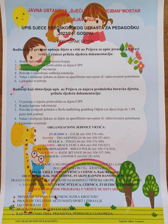 Javni natječaj za upis djece u vrtić objavit će se na web stranici Ustanove, oglasnim pločama vrtića i putem medija, 1. lipnja 2023. godine, a redoviti upis obavljat će se u periodu od 15. do 20. lipnja 2023. godine, navodi se u priopćenju iz JU Dječji vrtići Mostar.