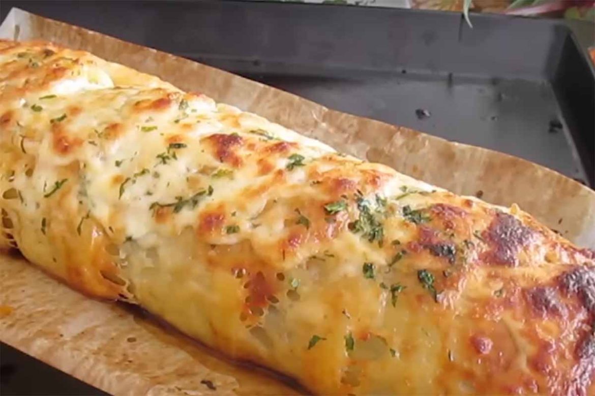 Uz pomoć papira za pečenje ispod pečenog krumpira zarolajte ovu musaku u štrucu (kao roladu). Neka završetak bude ispod vaše rolade. Vrh rolade posipajte preostalim sirom i svježim peršinom. Pecite još 10-ak minuta na 200 °C, odnosno dok se sir ne otopi i dobije lijepu zlatno-smeđu boju.