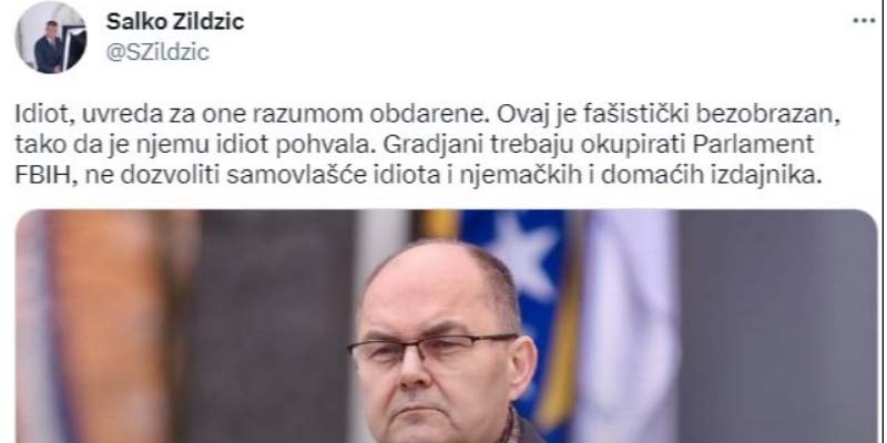 – Idiot, uvreda za one razumom obdarene. Ovaj je fašistički bezobrazan, tako da je njemu idiot pohvala. Građani trebaju okupirati Parlament FBiH, ne dozvoliti samovlašće idiota i njemačkih i domaćih izdajnika – kazao je.