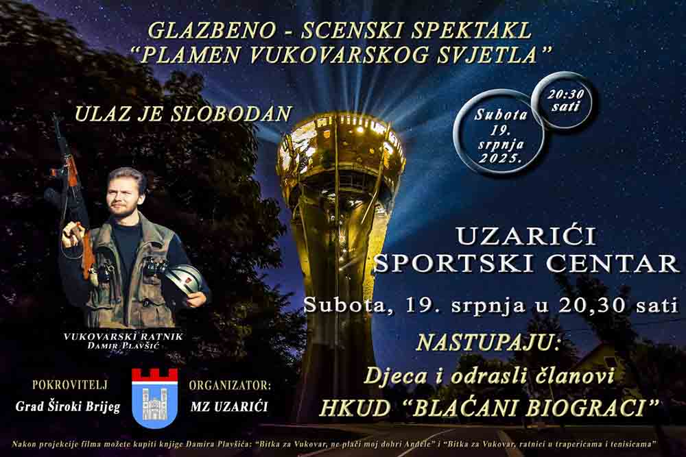 Pridruลพite nam se svi vi koji ลพivite u Mostaru, ล irokom Brijegu, ฤitluku, Grudama i okolnim mjestima u subotu 19. spnja s poฤetkom u 20,30 sati iย pogledajte ovaj jedinstveni spektakl koji je obiลกao svijet. U sklopu spektakla pogledajte film “Bitka za Vukovar”, izvedbu HKUD-a “Blaฤani Biogradci” i posluลกajte predavanje o obrani Vukovara koje ฤe odrลพati ratnik Damir Plavลกiฤ.
