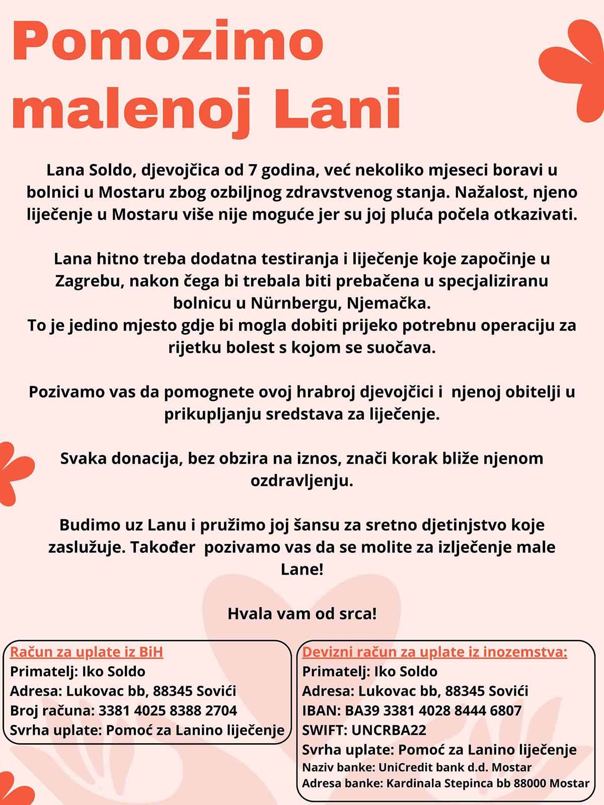 Svrha uplate: Pomoć za Lanino liječenje
