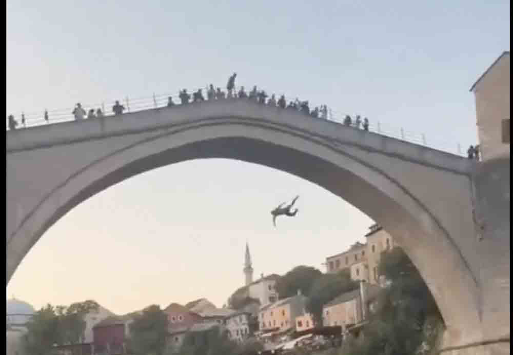 Na snimci koja se ubrzano proširila društvenim mrežama vidi se kako mladić, bez ikakve sigurnosne opreme i bez prethodne najave hitnim službama, preskače zaštitnu ogradu Starog mosta i izvodi skok u rijeku.